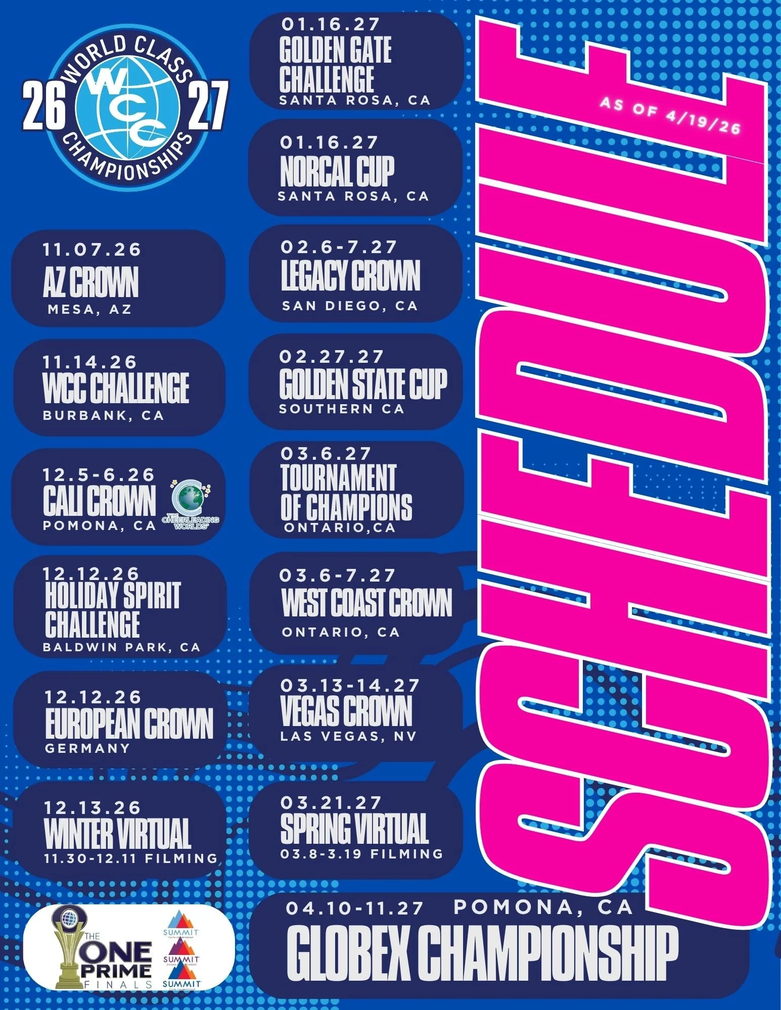 World Class CompetitionsCheck out our 2026-2027 Competitions! VIRTUAL & IN PERSON COMPETITIONS Click Here to Register Click Here to Register Email us at info@wccheer.com DIVISIONS • RULES • SCORING Click Here Click Here